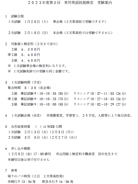 校内申し込み期間は12月8日(金)までです。申込用紙と受験料(※画像ファイルを参照)を、職員室・田中先生まで持参してください。