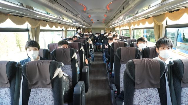 最新型のコロナ対応車両に乗車した生徒たち。ベテランガイドさんとともに出発しました。