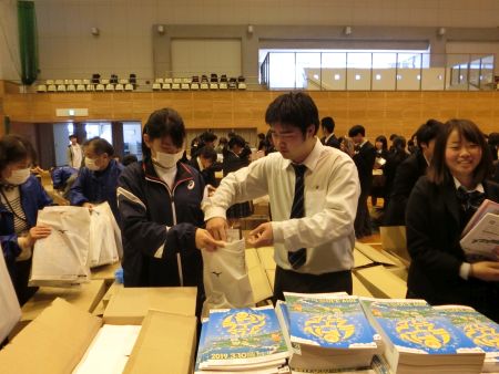 生徒は天草パールラインマラソン大会に出場するランナーの皆さんに贈る参加賞の袋詰めボランティアを行いました。