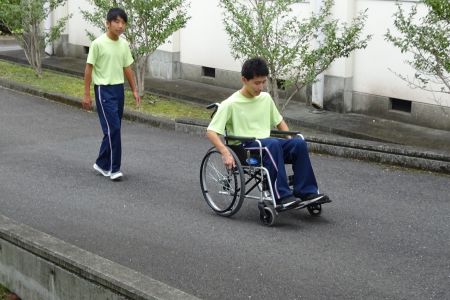 1年福祉科の「生活支援技術」の授業では、車いすの介助実習を行っていました。
