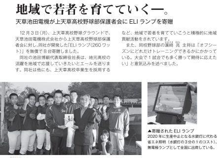 地元企業の天草池田電機様から上天草高校野球部保護者会にELIランプが寄贈され、その目録授与式の様子が紹介されました。同社は、上天草高校卒業生を採用するなど、地域で若者を育てていこうと積極的に地域貢献されている企業です。地域の応援を受けながら、大会で1試合でも多く勝利を収めると共に、部活動で学ぶチームワークの大切さを学んで欲しいです。