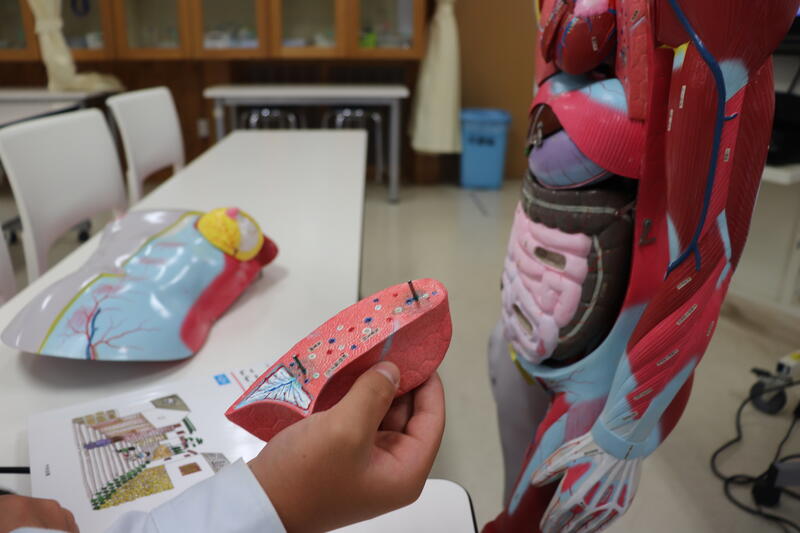 福祉科では「こころとからだの理解」という授業が1年生から3年生まであります。今日は2年生が、発達と老化の分野で呼吸器系の学習をしました。興味深く肺の構造を見ています。こころとからだについての学習を深めていくことは介護の知識に加えて、部活動、幅広い分野で生かされてくるのではないかと思います。