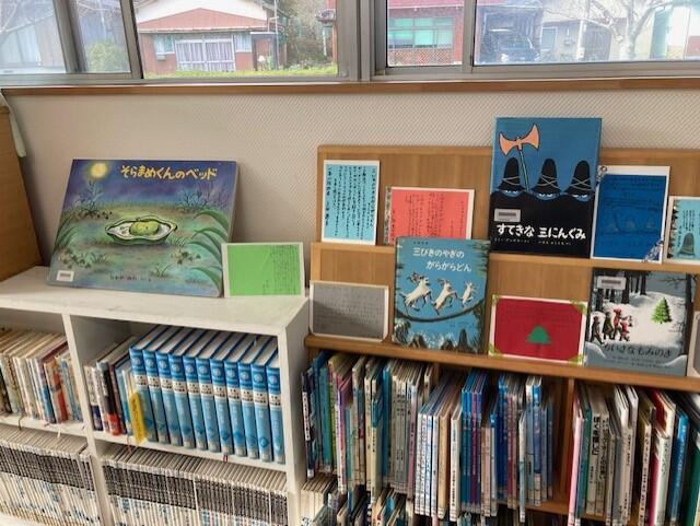 1年生の国語の授業で、図書館を利用して絵本のブックレビューを作っていただきました。