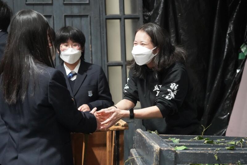 上演後には、特別にステージや舞台裏の見学ができるようにしていただきました。舞台道具を手に取ったり、機械装置の仕組みについて説明を受けていました。また、演者の方々とお話しをする期会もいただきました。お疲れかと思いましたが、生徒一人一人に笑顔でお話しや握手をしていただきました。生徒の高校生活の思いでの一つとなりました。