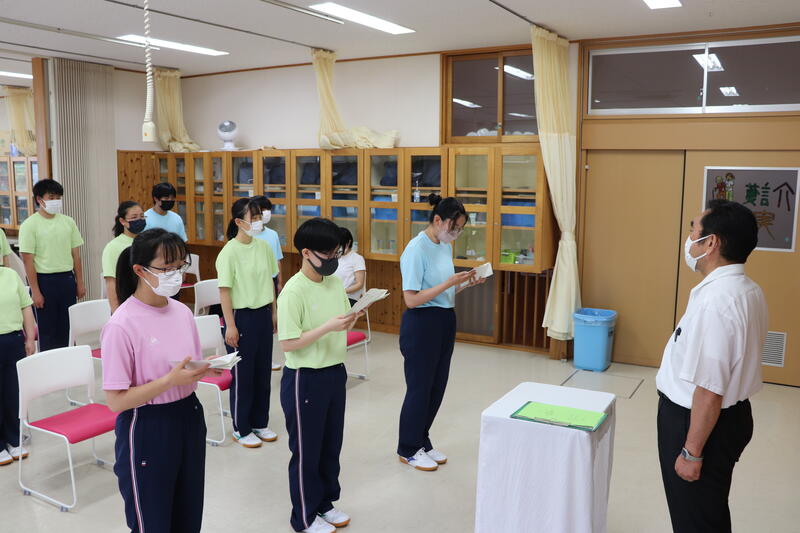 3年福祉科介護福祉類型を代表した嶋﨑さんからは、利用者の個別性を大切にした介護を実践するため、積極的に実習に臨むことを誓いました。