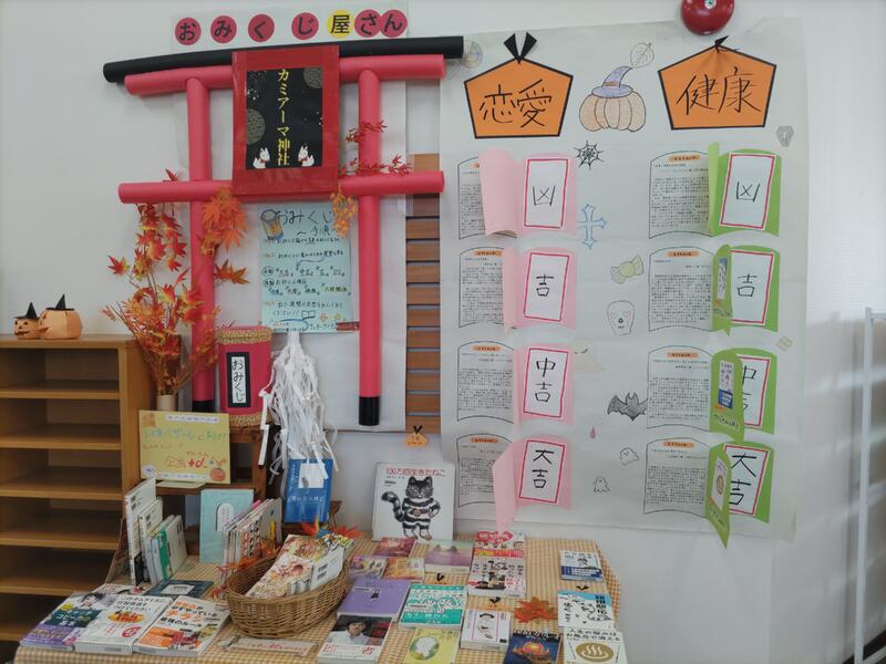制作したおみくじや鳥居が好評でしたので、読書週間の時期に合わせて、図書館内に引き続き展示しています。