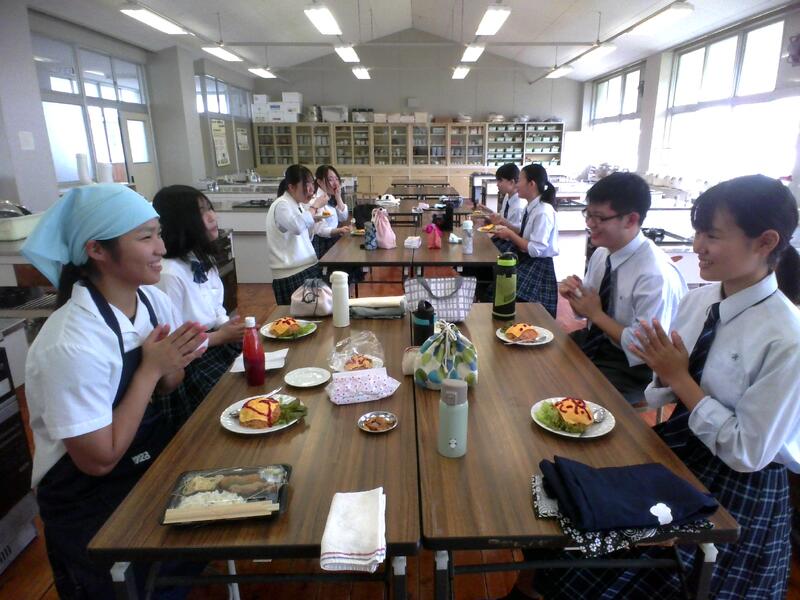 写真では試食中のため外している生徒もいますが、各自がフェルトで工夫を凝らした個性豊かなエプロン姿で実習に臨みました
