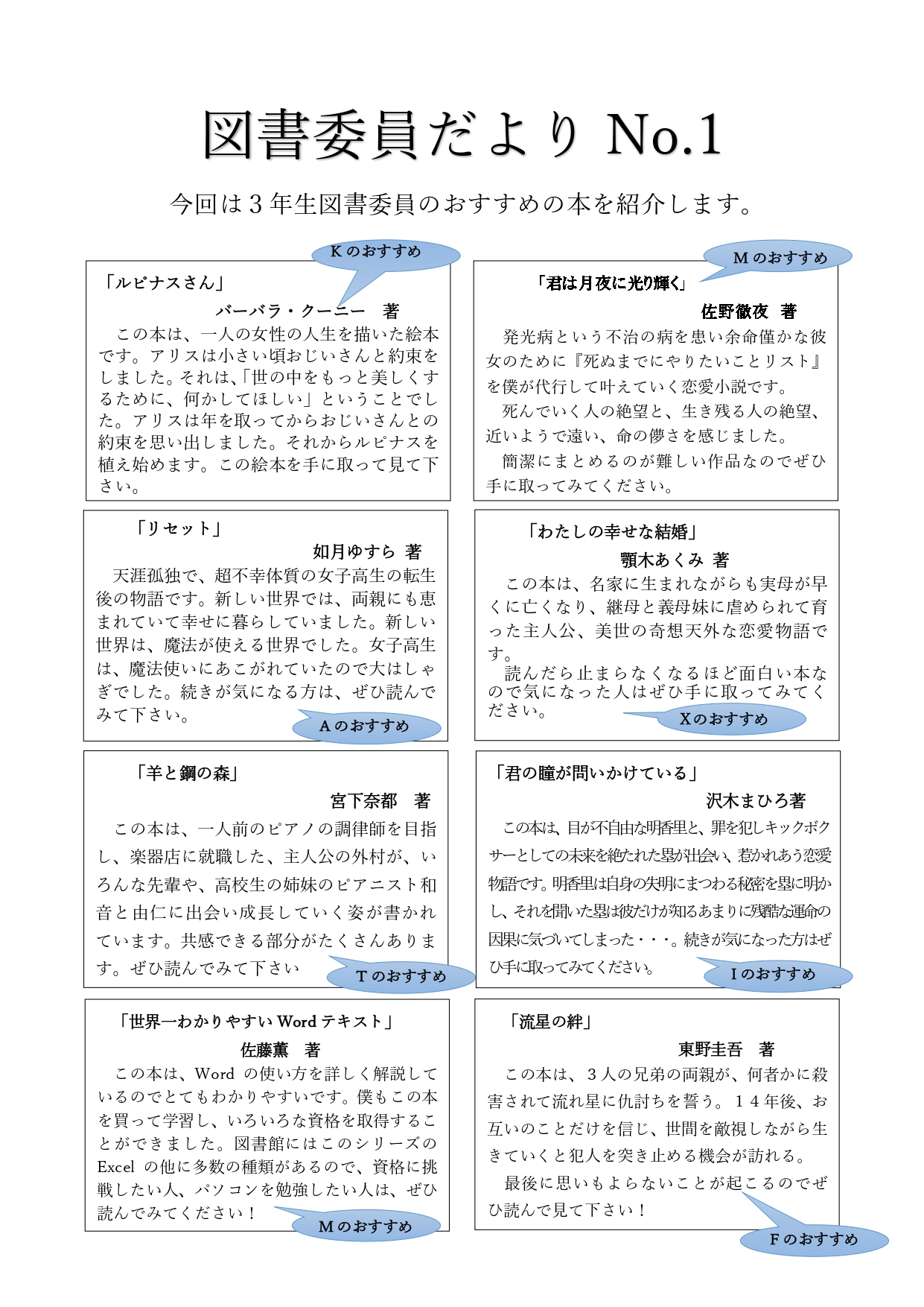 上天草高校の図書委員会では、定期的に「図書館だより」を発行しています。こちらは、3年生の図書委員会の生徒の皆さんが作成した「図書委員だより」です。生徒がオススメする本の紹介文が載っています。