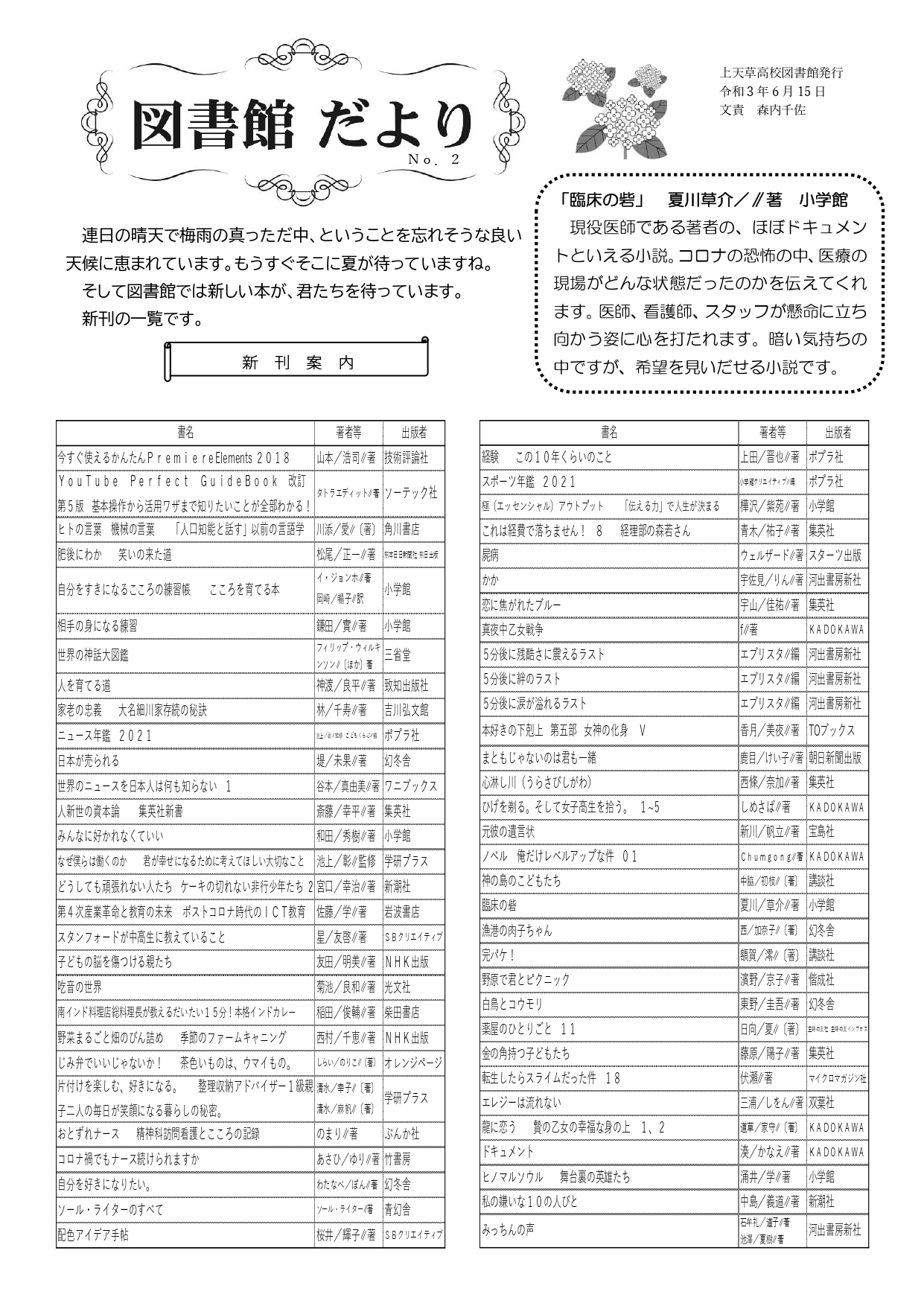 こちらは、図書司書の先生が作成された「図書館だより」です。生徒や先生たちに紹介したい新刊情報が載っています。