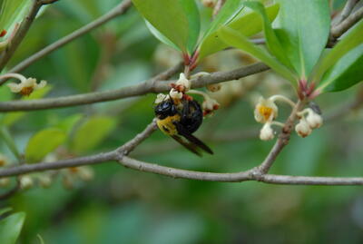 モッコク(ツバキ科) 10m程度になる小高木。径2cm程度の小さな花をたくさんつける。早朝、この蜜を吸いにたくさんの数のマルハナバチ(益虫、刺さない)がやってきている。 |