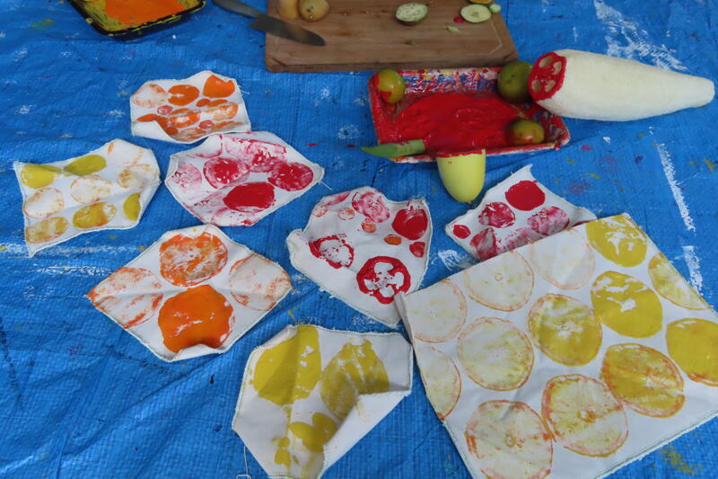 Mikoバッグは、身近にある素材にペンキを付けて、スタンプのように押しながら一つ一つ柄を付けていきます。