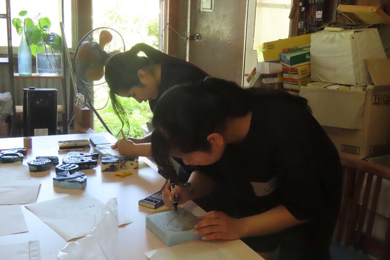 その後、自分たちが考えたデザインを「スタイロ」という素材を用いてスタンプの型を作り、帆布と呼ばれる布地にポンポン!