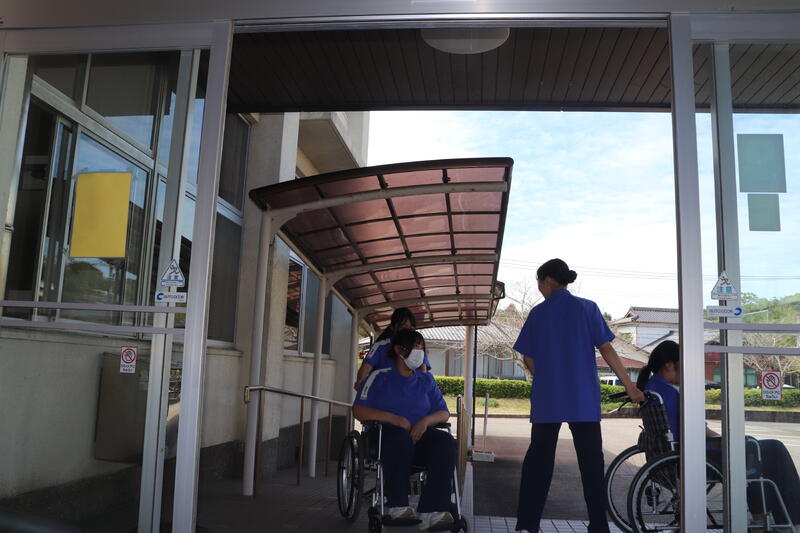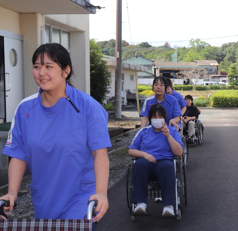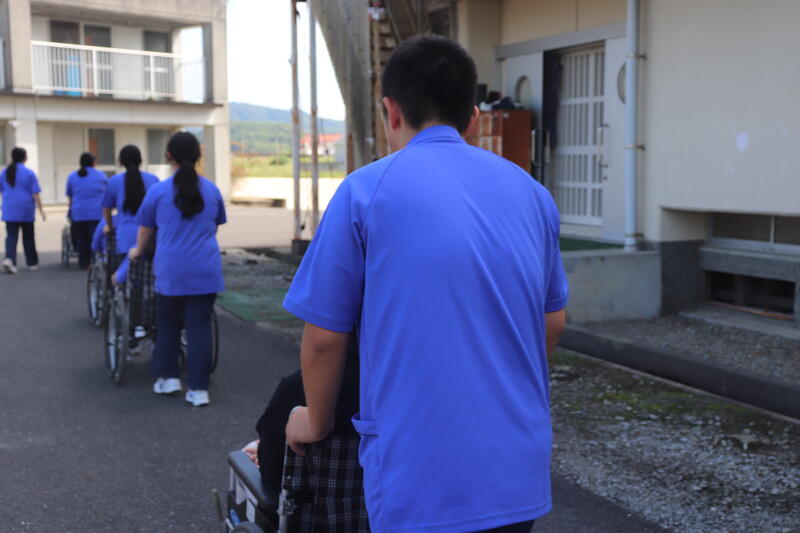 車いすで校内を実際にまわってみました。利用者の方が外出を楽しみにされている気持ちに共感した生徒です。これからもみんなで、安心・安全な移動介助を学んでいきます。