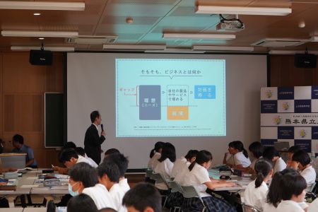 先進出前講座として、日本政策金融公庫国民生活事業熊本創業支援センター所長尾﨑真哉様、上席所長代理石﨑勇様をお招きし、『ビジネスプランを創ろう!』をタイトルにお話しいただきました。