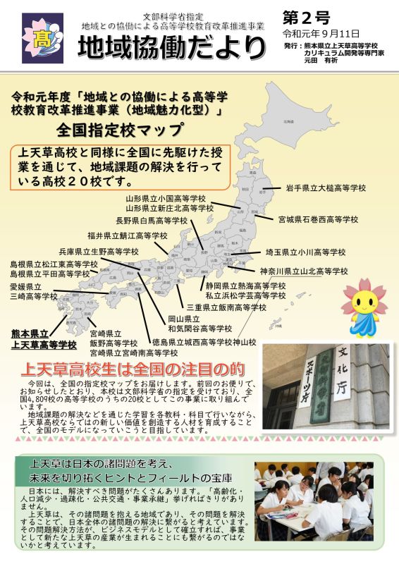 今回は、文部科学省より指定を受けた20の高校マップを掲載しています。また、今後の上天草プロジェクトについて掲載しています。