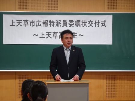 本日は、上天草市長堀江隆臣様をお招きし、広報誌「上天草」の高校生特派員委嘱状の交付式が行われました。