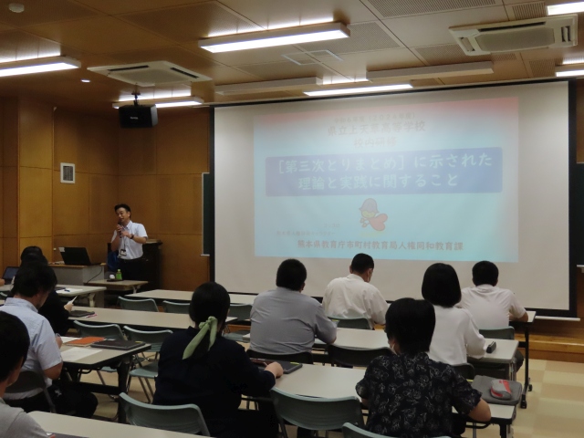 本日は、熊本県教育庁市町村教育局人権同和教育課より講師をお迎えして、教職員全員を対象に人権教育の校内職員研修を行いました。