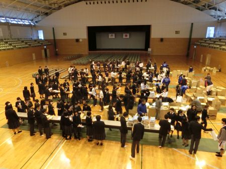 生徒は天草パールラインマラソン大会に出場するランナーの皆さんに贈る参加賞の袋詰めボランティアを行いました。