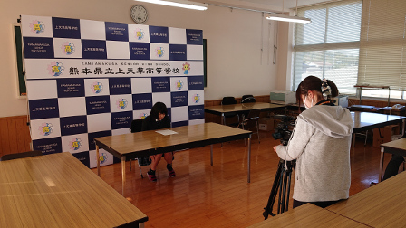 生徒会会長による年頭挨拶の収録 投稿日時 : 2018/12/25 作成者1 本校会議室にて、天草ケーブルテレビの「生徒会会長による年頭挨拶」の収録が行われました。生徒会長荒川留凪さんが緊張しながらも立派に挨拶を行いました。1月1日~8日の間で複数回放映されるとのことですので、ぜひご覧ください。