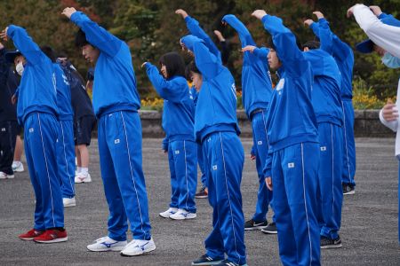 朝の集いでは、国旗掲揚・ラジオ体操・チクサクコールが行われました。