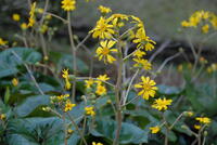 ツワブキ(キク科) 晩秋から初冬にかけて花が咲く。同じキク科で春に開花するフキに比べて葉の表面に光沢があり区別ができる。食用・薬用となり、観賞用としてもよく見かける。 |