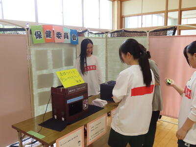 図書館棟では、保健委員会や図書・放送委員会、食バザーの準備が進んでいます。