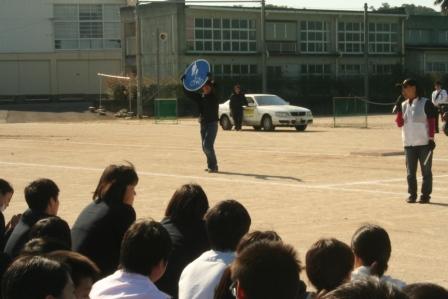 10月24日にスタントマンを使用した自転車交通安全教室が行われました。迫力のある事故の再現に、生徒たちは目が離せない様子でした。二名の生徒が前に出て、実際に安全運転を実践する場面もありました。