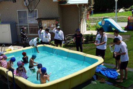 プール遊びの補助では元気いっぱいに遊ぶ園児から水を掛けられる生徒もいました。