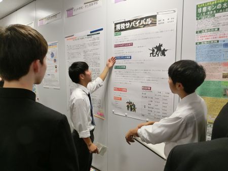 ポスターセッションとは、生徒が挑戦した研究や調査の成果をA1サイズの用紙にまとめます。研究発表のポスターを貼り付け、出席者から発表者に対して質問に答える形で行なわれます。