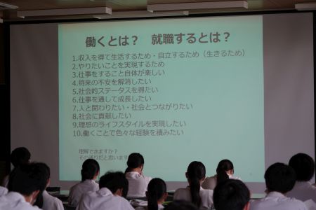 本日7限目。3年普通科普通コース・情報会計科・福祉科の生徒を対象に、本校のキャリアサポーター坂口先生より就職活動についてご講話いただきました。