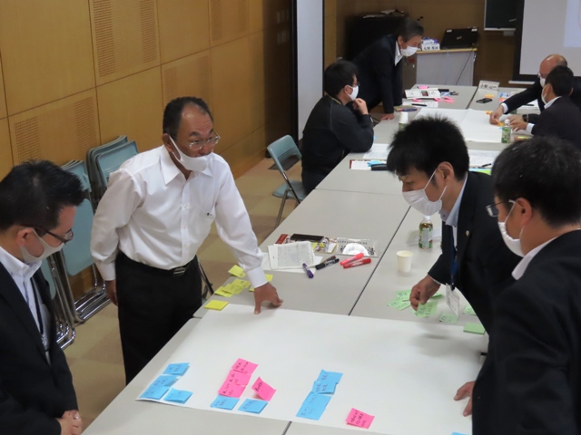 メインの協議題は、来年度普通科3年生が履修する「地域イノベーション研究」の開発。今日はその基礎となる「地域が求める能力」と「その育成方法案」を検討してもらいました。