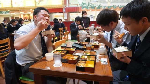 今回も商業研究部の生徒が参加しました。「チラシ班」「調理班」「販売班」の三つに分け、それぞれの班を生徒が時間ごとに体験できるものでした。