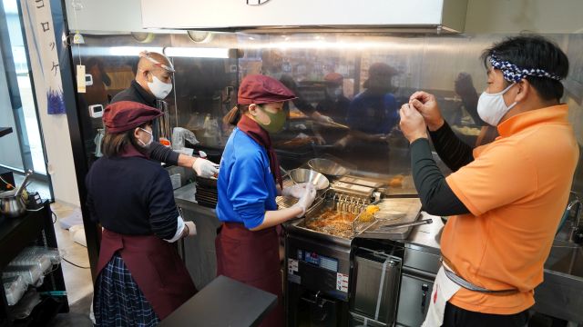 販売班では、温かいコロッケを温かいままお届けするよう心掛けていました。「ありがとうございました」の言葉を忘れず、マスクの下は常に笑顔で接客を心掛けるようにしていました。