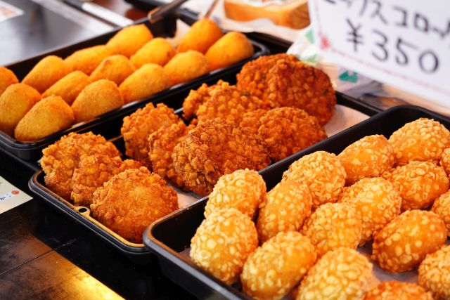 綺麗な揚げ色になった3種のコロッケ。実際の商品が目の前に並ぶとお客様の関心も高まります。