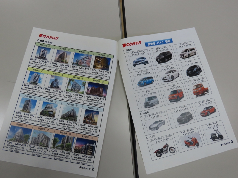 生徒の将来をイメージさせる「夢のカタログ」。どこに住むのか?どんな車に乗るのか?などを選択することで、将来にかかるお金を計算することができます。
