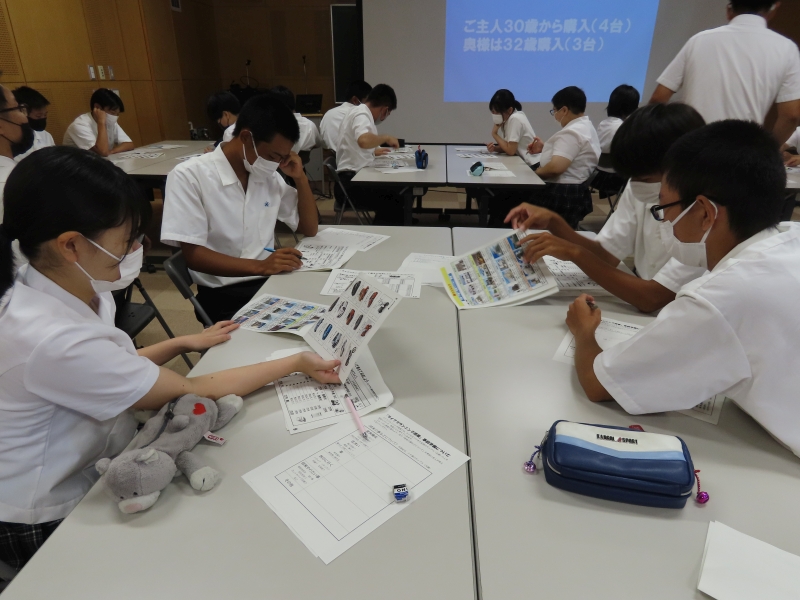 将来の夢をかなえるために必要なライフプランの立て方を学ぶ授業。社会経済の仕組みや、働き方による年収の差、早期離職のマイナス面や熊本で暮らすことのプラス面などを、ワークショップによる体験の中からわかりやすく学びました。