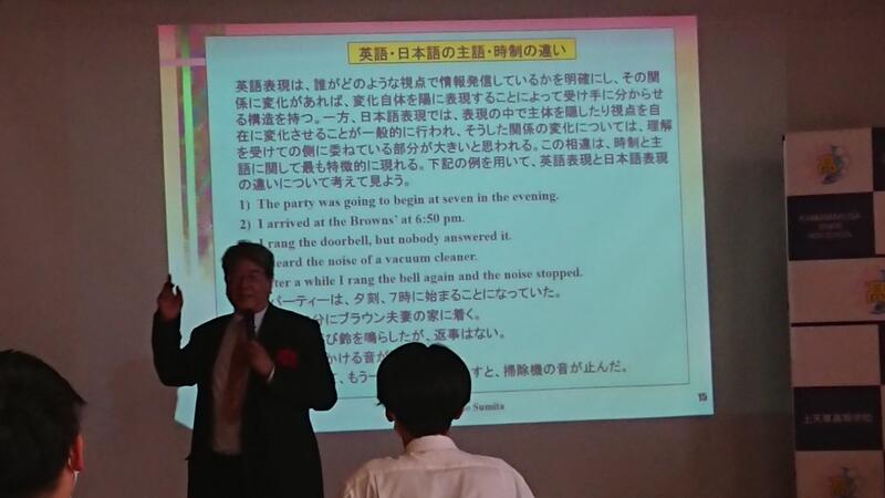 開塾式では、上天草市教育委員会の高倉教育長から温かいメッセージをいただき、その後、上天草市地域おこし協力隊の野口様より、今後のスケジュール等について紹介がありました。また、開塾式後は、慶應義塾大学大学院経営研究科嘱託講師で、筑波大学名誉教授の住田潮先生を講師にお迎えして、「英語の学び方」の基調講演をいただきました。特に住田先生からの「自分自身でいやなことをやるときに、楽しんでやれる方法(心理的距離を短くする方法)を見つけ出しなさい」という激励は印象的でした。講演の後はそれぞれに分かれて学習塾が展開されました。