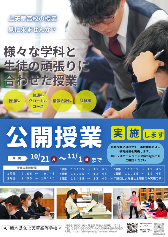 ぜひ上天草高校の授業をご参観いただき、皆様からの御意見や御感想を頂戴できましたら幸いです。