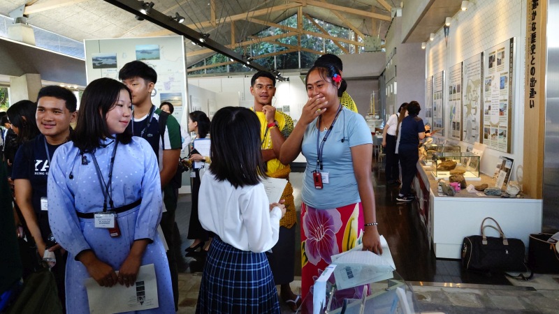 高校生サミットの開催に向けて上天草高校(2年生)ではスタディツアーを企画しました。天草ビジターセンターにおいて、世界各国から集まった若者たち(津波防災大使)との交流会が開かれました。