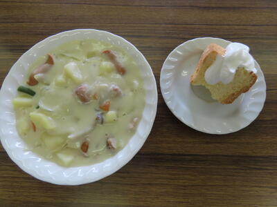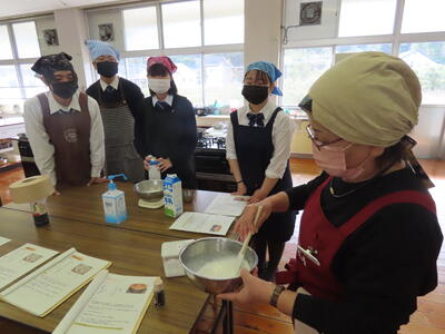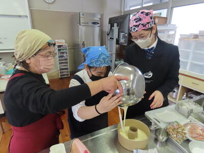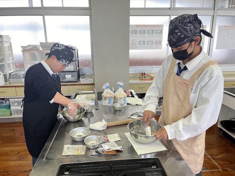本校では、1年・2年福祉科、3年福祉科地域類型の生徒が、米粉のシチュー、米粉のシフォンケーキに挑戦しました。