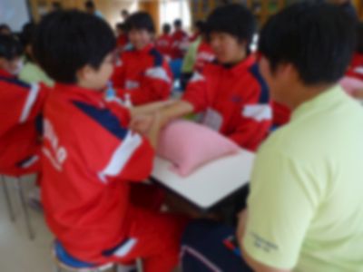 中学生の皆さんはペアを組み、福祉科の生徒の皆さんによる指導のもと、ハンドマッサージを体験しました。