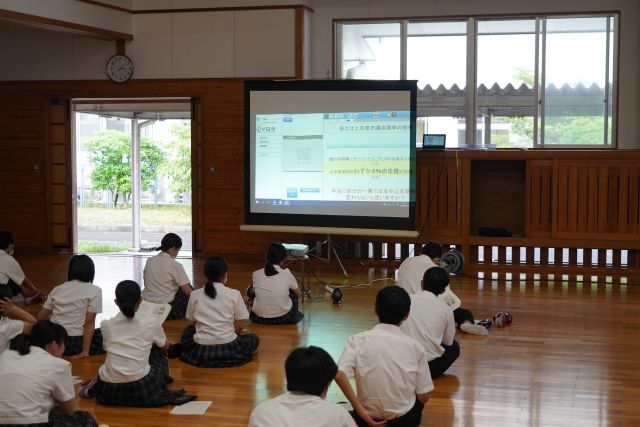 3年生は体育館。2年生は視聴覚室。1年生は武道場に分かれ、Web会議システムを利用したリモート講演会の形式を取りました。