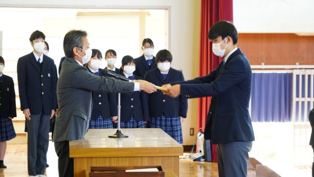 終業式に先立って、3学期に行われた大会や検定試験、1カ年皆勤賞等の表彰が行われました。