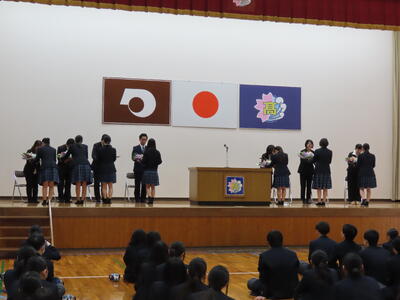 終業式の前に行われた表彰式では、学業や芸術、スポーツ等において優秀な成績を収めた生徒が表彰されました。