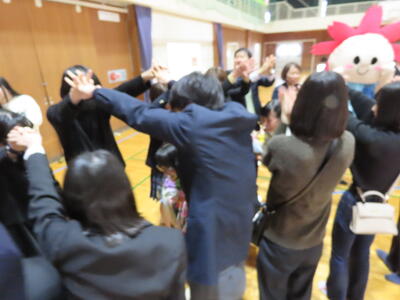 式典の最後には、全校生徒、教職員、さらにOB、OGで長い「花道」を作り、拍手で先生方をお送りしました。その花道には、本校のマスコットキャラクター「カミ・アーマちゃん」も駆けつけてくれました。