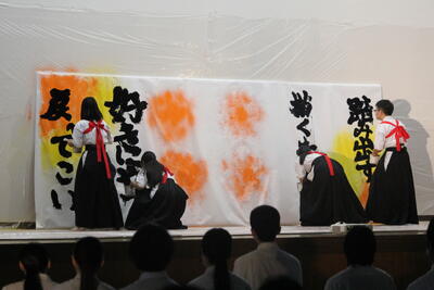 私たちは、大会入賞に向けて、週に3回しかない練習を頑張っています。書道部は、静かで地味なイメージがありますが、文化祭では毎年袴を着て、書道パフォーマンスを行っています。書道を頑張りたい人や、袴を着てみたい人は是非書道部に入ってみてください。
