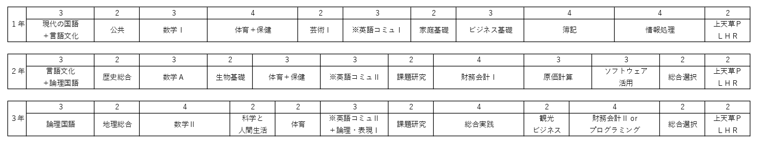 | 英コミⅠ...英語コミュニケーションⅠ 芸術...音楽Ⅰ・美術Ⅰ・書道Ⅰからの選択 ビジ基礎...ビジネス基礎 総探...総合的な探究の時間 |