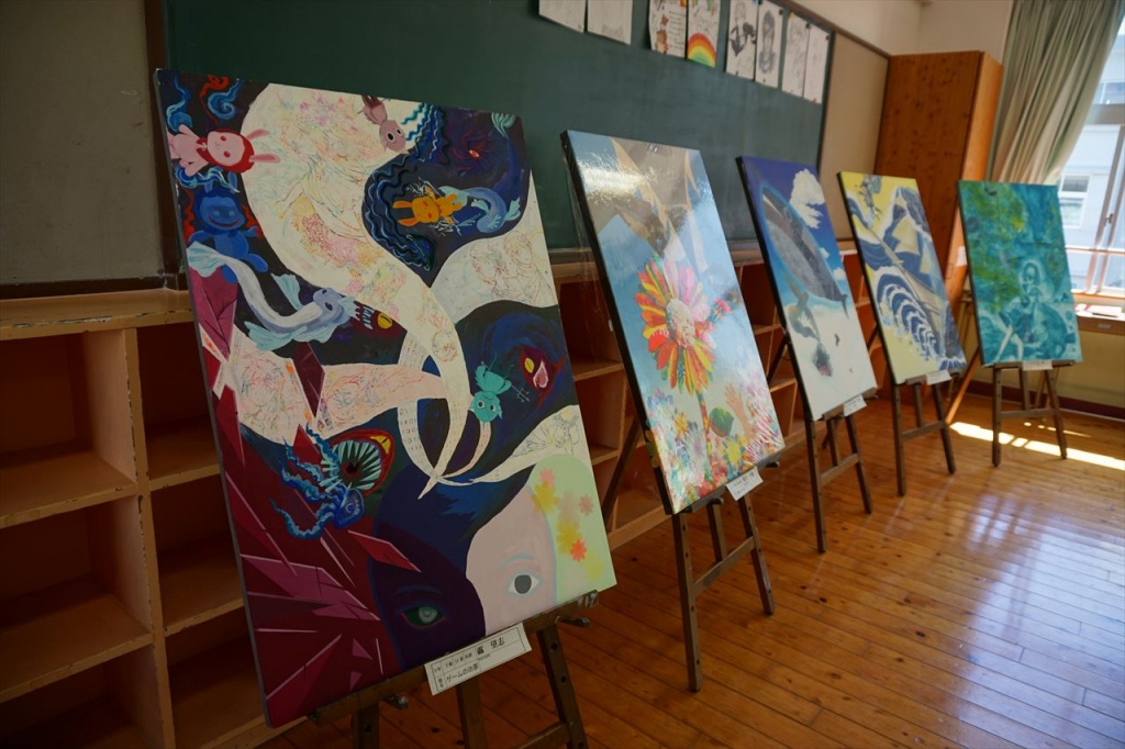 現在、肥後銀行山鹿東支店のロビー壁面をお借りして、美術部員が描いた読書感想画を3点と文化祭ポスター原画1点を展示しています。10月29日(金)まで展示予定です。近くまでお越しの際は、ぜひご覧ください。