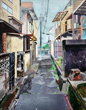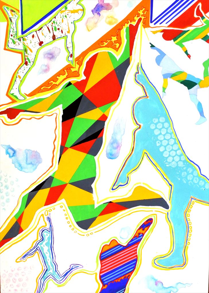 選手がゴールした時の順位が確定する瞬間のアスリートの喜びと充実感とともに、観客たちの応援や歓喜といった感情を、様々な手法を利用した塗り方によって表現したいと考えて創作しました。