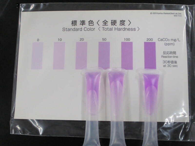 パックテストのキットを使って、水道水、市販の2種類の硬水の塩素濃度と硬度を測りました。
